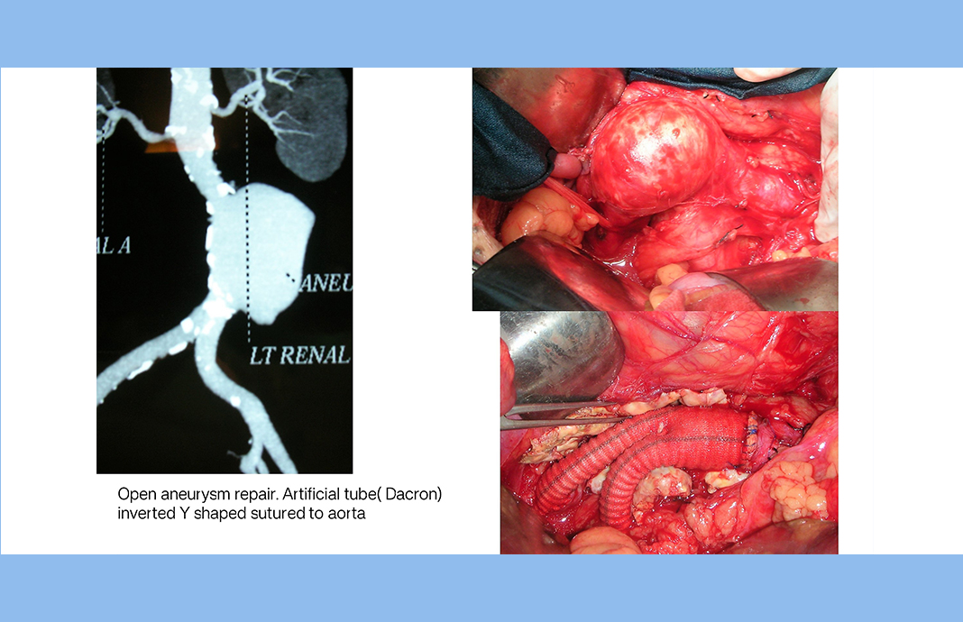 Surgical repair involves removal of the diseased portion of the aorta. Clamps are placed above and below the aneurysm, which is then cut out and removed. A fabric tube, or graft, is sewn onto both cut ends to replace the diseased portion that is removed. The most common site for aortic aneurysm is in the abdomen involving the aorta below the renal arteries. A inverted Y shaped graft is sutured to the aorta after removing the diseased aorta. This is a major operation, needing stay in the ICU for 2-3 days and in the hospital for nearly one week or more. Patients generally take a month to resume their normal activities. Hence minimally invasive stent procedures have become popular