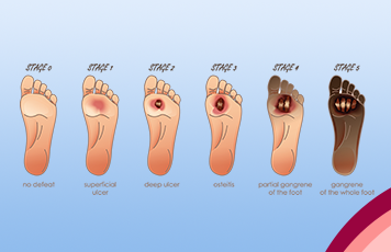 Common causes for foot ulcer are numbness or poor sensation in the foot (Diabetic Neuropathy), poor blood supply to foot and improper foot wear. Changes in biomechanics of the foot due to neuropathy leads to development of callosity over pressure points in the foot. This leads to development of ulcer (Plantar trophic ulcer). Since the pain sensation is diminished patient becomes unaware of injuries or ulcer leading to spread of infection. When blood supply is reduced due to block in the arteries the ulcer does not heal. Poor sugar control is another important cause for infection and spread leading to gangrene of the toes or the foot.